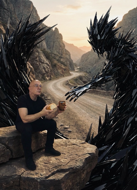 The black glass turned clear and bright. The monster did not strike; instead, the swirling form settled down, mimicking the man’s posture. As the man took a drink of water, the Beast dissolved into a gentle mist, washing over the pass like a cool rain.